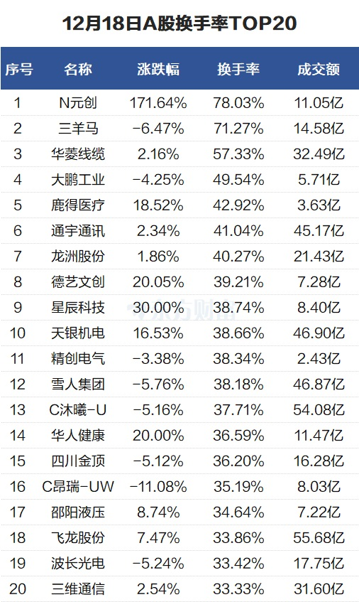 当天换手率最高的个股为N元创,全天换手率78.03%。三羊马紧随其后,全天换手率71.27%。