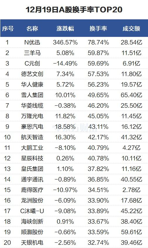 当天换手率最高的个股为N优迅,全天换手率78.74%。三羊马紧随其后,全天换手率59.87%。