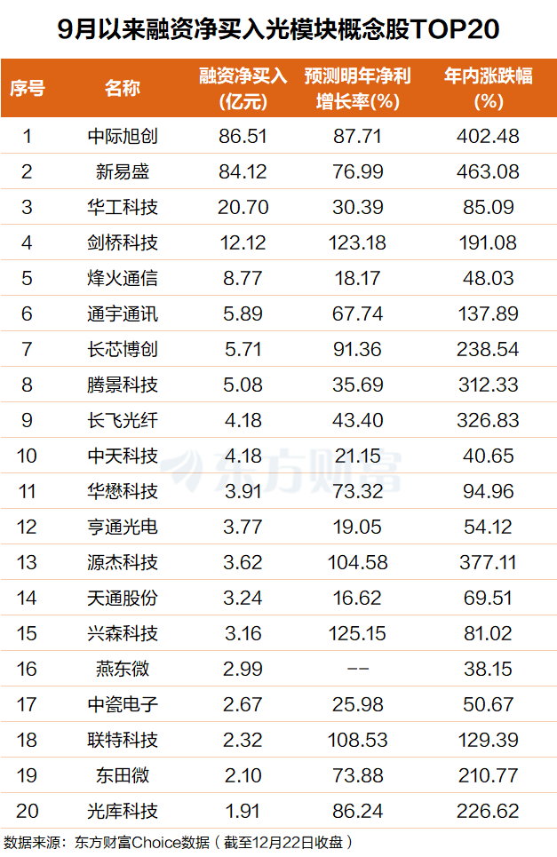 长芯博创、中际旭创、光库科技、新易盛、东田微、华懋科技等个股机构预测明年净利润增幅在91%至70%之间不等。