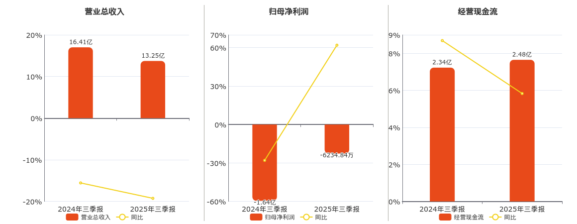 公司营业总收入为13.25亿元,较去年同报告期营业总收入减少3.16亿元,同比较去年同期下降19.26%。归母净利润为-6234.84万元。经营活动现金净流入为2.48亿元。