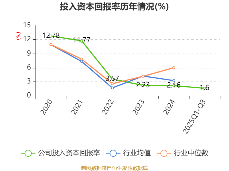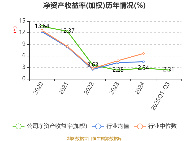 盈利能力方面, 2025年前三季度公司加权平均净资产收益率为2.31%,同比下降2.14个百分点。公司2025年前三季度投入资本回报率为1.6%,较上年同期下降2.24个百分点。