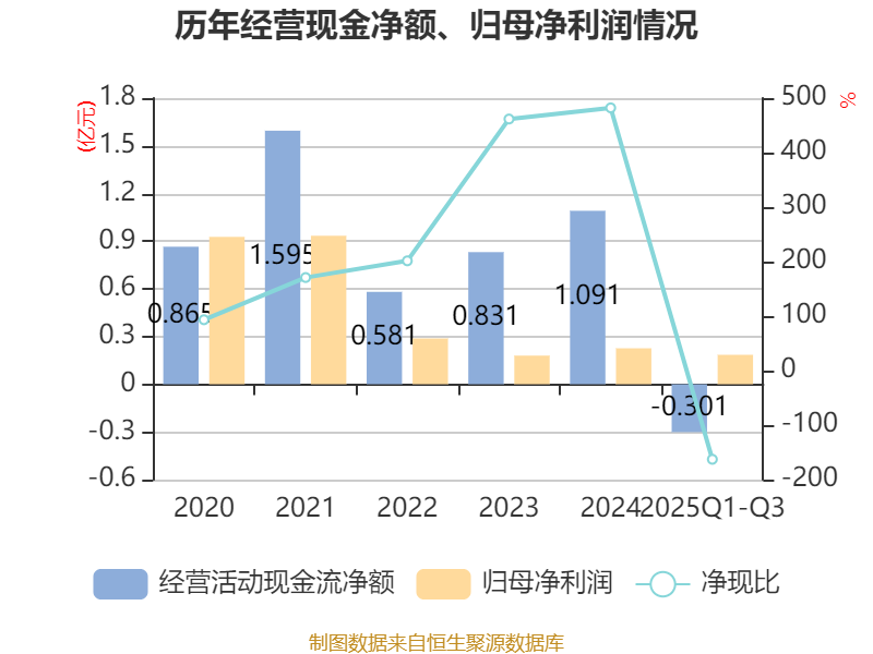 2025年前三季度,公司经营活动现金流净额为-3008.63万元,同比减少7949.43万元;筹资活动现金流净额3975.19万元,同比增加5021.14万元;投资活动现金流净额-1223.26万元,上年同期为-4477.13万元。