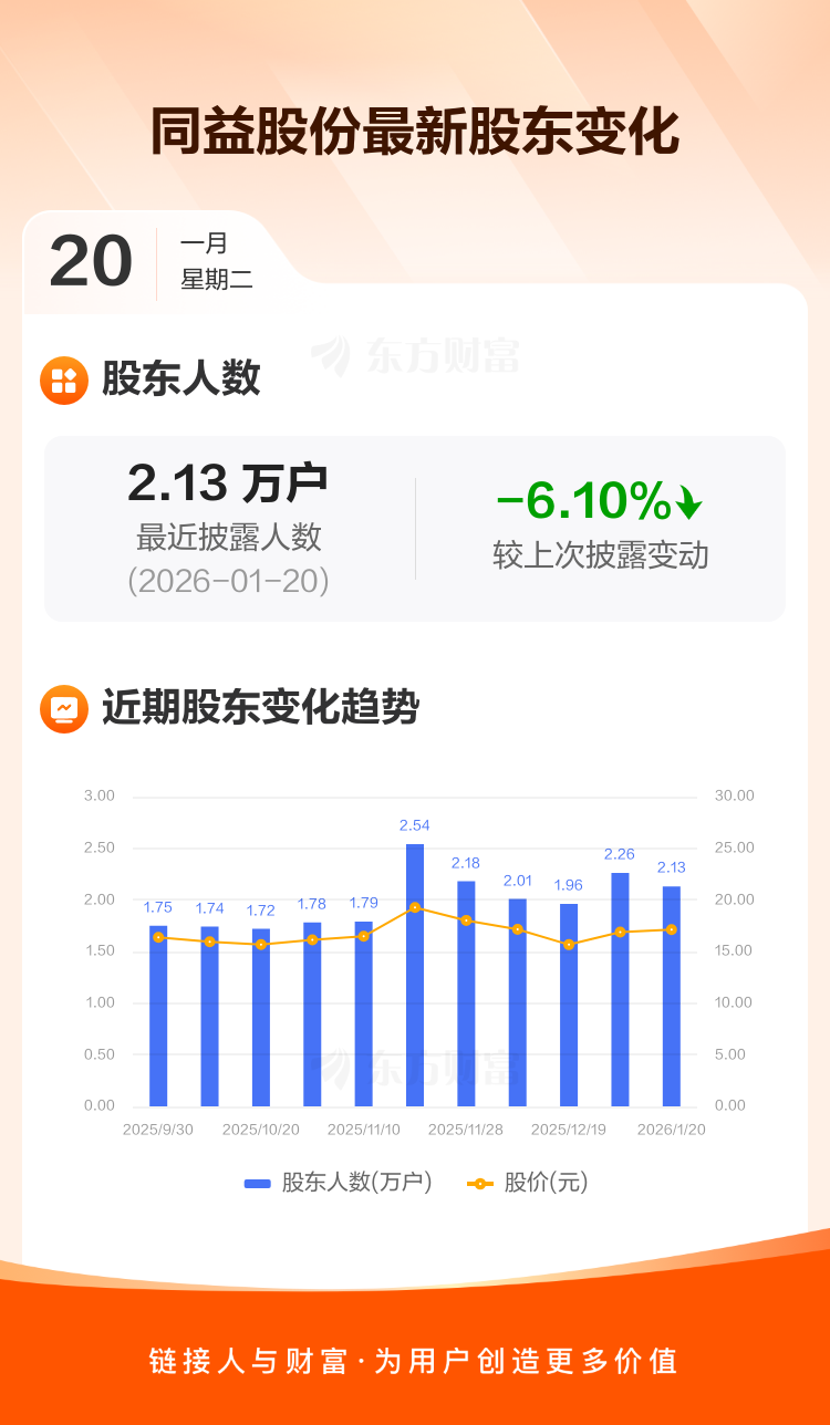 同益股份最新披露数据显示,截至1月20日公司股东户数为2.13万户,较上期(2026年1月9日)减少1382户,降幅为6.10%。户均持有流通股数量由上期的5341股上升至5688股,户均持股金额由上期的9.02万元增加至9.73万元。