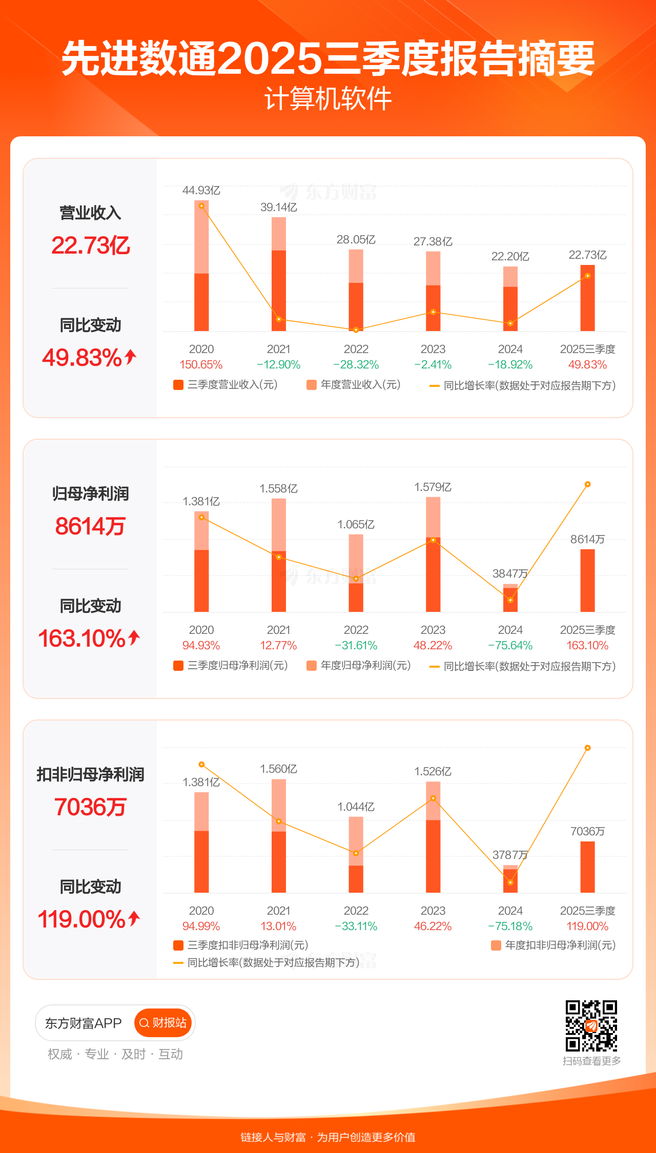 先进数通10月30日发布2025年三季报显示,公司前三季实现营业收入22.73亿元,同比增长49.83%;归母净利润8614.46万元,同比增长163.10%;扣非归母净利润7036.24万元,同比增长119.00%。