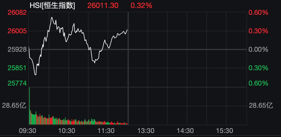 港股市场今天上午整体窄幅震荡,市场走势震荡胶着,恒生指数围绕26000点整数关口上下波动。