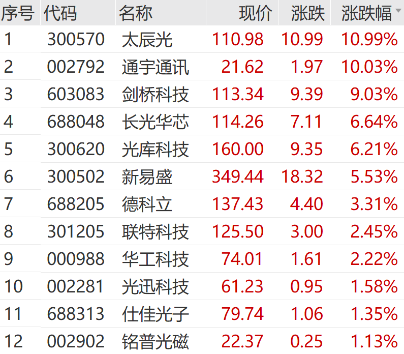 11月27日上午,光模块概念股持续走强,通宇通讯涨停,剑桥科技盘中涨停后开板,太辰光涨超10%。