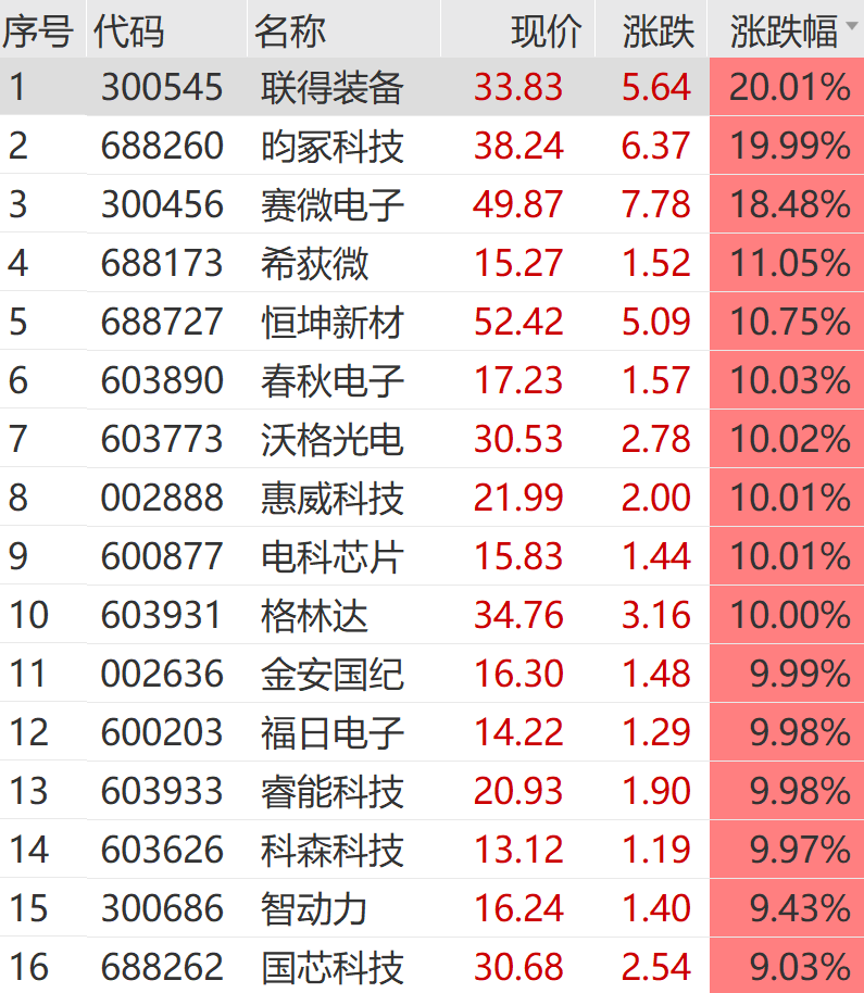 个股方面,联得装备、昀冢科技20cm涨停,赛微电子20cm涨停后开板;春秋电子、沃格光电、金安国纪等多股涨停。