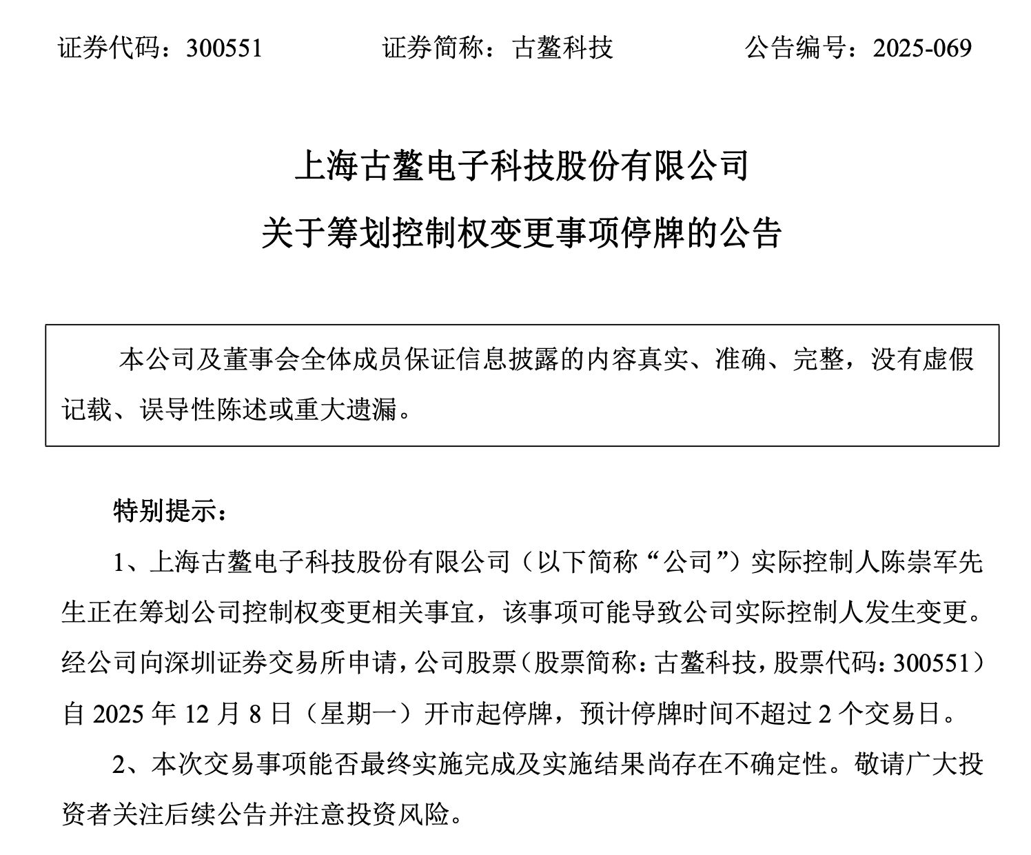 12月7日,古鳌科技(300551.SZ)公告称,公司实际控制人陈崇军正在筹划公司控制权变更相关事宜,该事项可能导致公司实际控制人发生变更。目前,各方主体正在就具体交易方案、协议等相关事项进行论证和磋商,具体情况以各方签订的相关协议为准。经公司向深圳证券交易所申请,公司股票自2025年12月8日开市起停牌,预计停牌时间不超过2个交易日。