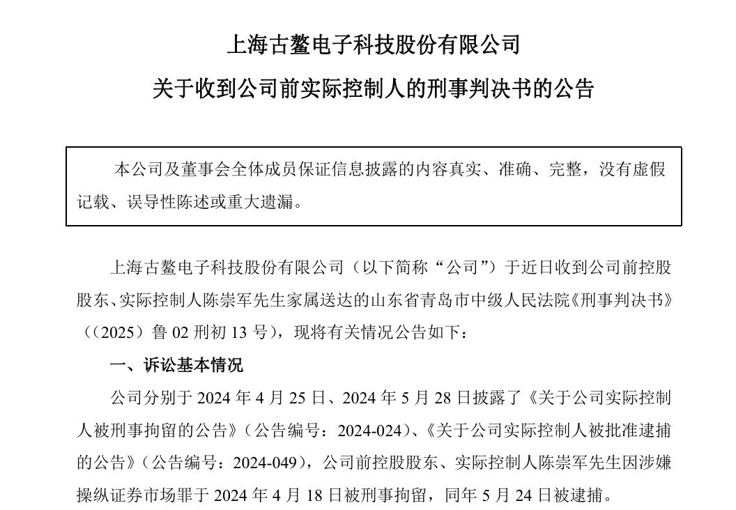 12月18日,古鳌科技(300551.SZ,股价16.70元,市值56.79亿元)公告称,公司前控股股东、实际控制人陈崇军因操纵证券市场罪被判处有期徒刑六年,并处罚金人民币四百万元。陈崇军于2021年10月28日辞去总经理职务,2023年5月19日卸任董事长职务,此后未在公司担任具体职务。上述判决为股东个人行为,不会对公司生产经营产生重大不利影响。目前,公司经营情况正常。本次判决为一审判决,尚未生效,如陈崇军在法定期限内提起上诉,最终判决及后续执行结果尚存在不确定性。