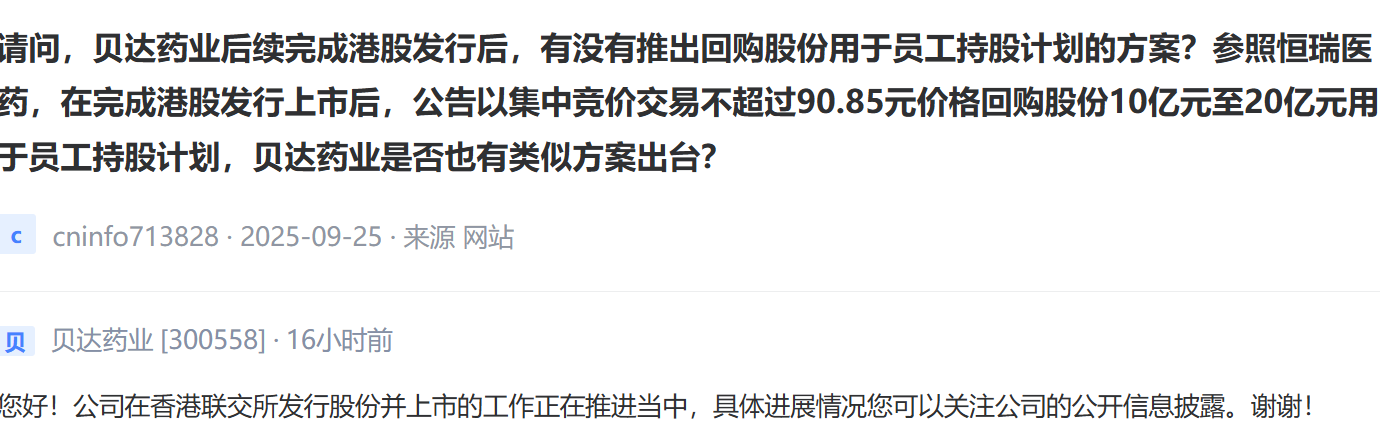 贝达药业三冲港股的疑问中,员工持股计划成为另一敏感按钮。投资者以恒瑞医药为例,提出“完成H股后立刻公告10亿-20亿元回购用于员工持股”。公司方面未给出任何量化指引,仅称具体进展情况可以关注公司的公开信息披露。