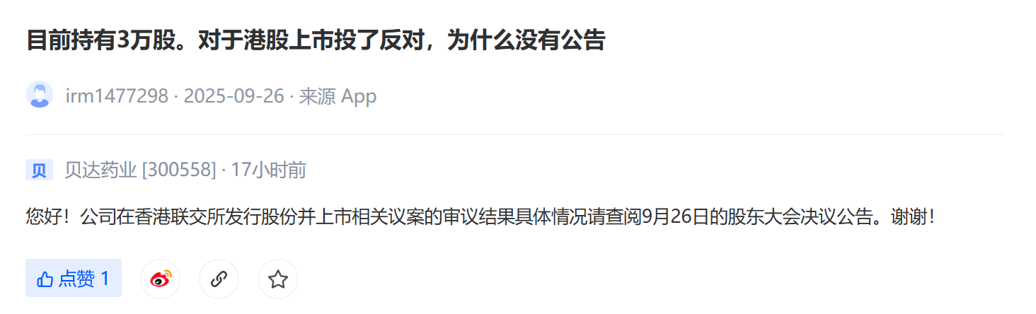 “目前持有3万股。对于港股上市投了反对,为什么没有公告”——面对贝达药业筹划港股再上市,投资者们不禁连连“叩问”:钱往哪儿花?八大在售品种为何卖不过伏美替尼单药?10月1日凌晨,贝达药业在投资者互动平台进行回复。