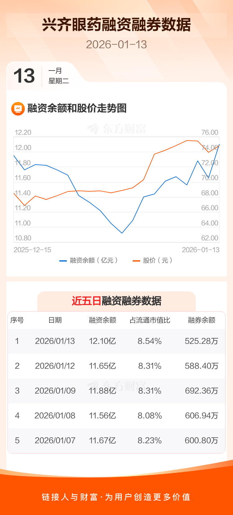 交易所最新数据显示,兴齐眼药于2026年1月13日获融资买入1.43亿元,融资偿还9785.57万元,当日融资净买入4561.98万元。目前,该股融资余额12.10亿,占流通市值比例为8.54%。