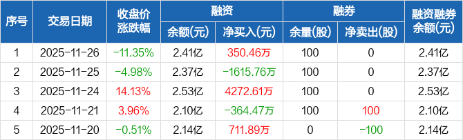 融资方面,当日融资买入8190.17万元,融资偿还7839.71万元,融资净买入350.46万元。融券方面,融券卖出0股,融券偿还0股,融券余量100股,融券余额1742元。融资融券余额合计2.41亿元。