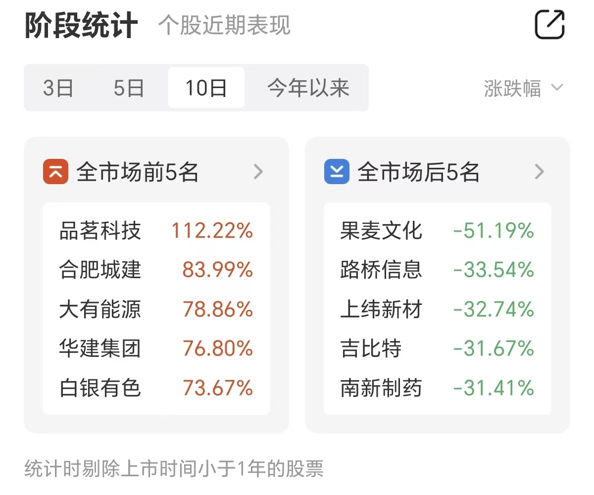 与此同时,近十个交易日涨幅前五名的个股分别为品茗科技、合肥城建、大有能源、华建集团、白银有色。