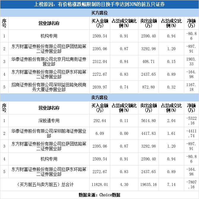 龙虎榜数据显示,今日共2个机构席位出现在龙虎榜单上,分别位列买一、卖四。合计净卖出80.86万元,占龙虎榜净卖额的1.04%。除此之外还有德科立、航天发展、盛新锂能等38只个股榜单上出现了机构的身影,其中18家呈现机构净买入,获净买入最多的是航天发展,净买额为1.47亿元;20家呈现机构净卖出,其中遭净卖出最高的为德科立,净卖额为1.50亿元。
