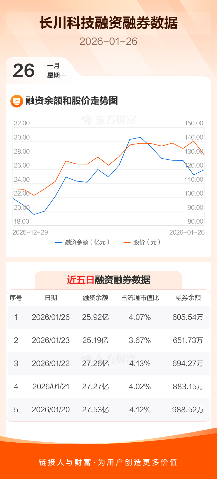 交易所最新数据显示,长川科技于2026年1月26日获融资买入4.15亿元,融资偿还3.42亿元,当日融资净买入7282.86万元。目前,该股融资余额25.92亿,占流通市值比例为4.07%。