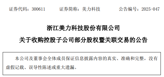 10月13日,美力科技(300611)公告称,公司拟以自有资金1500万元收购关联方——大圆钢业株式会社(以下简称“大圆钢业”)持有的北京美力大圆弹簧有限公司(以下简称“北京大圆”)及江苏美力大圆弹簧有限公司(以下简称“江苏大圆”)各10.1%股权。交易完成后,公司将持有北京大圆及江苏大圆各80.1%股权。