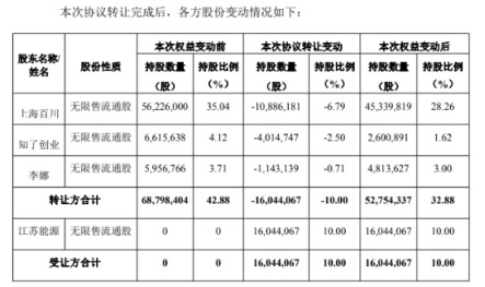 公告显示,1月30日,公司控股股东上海百川畅银实业有限公司(以下简称上海百川)、实控人李娜、陈功海及其一致行动人郑州知了创业企业管理咨询有限公司(以下合称转让方),与江苏能源物资有限公司(以下简称江苏能源)签署《股份转让协议》,拟以12.68元/股的价格,向江苏能源合计转让10%的公司股份,对应交易总价约2.03亿元。