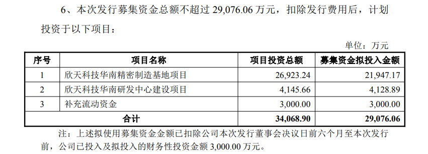 12月1日晚间,欣天科技(300615)公告,公司拟实施向特定对象发行股票计划,募集资金总额不超过2.9076亿元,用于欣天科技华南精密制造基地项目、欣天科技华南研发中心建设项目及补充流动资金。