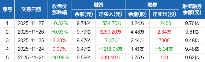 寒锐钴业:融资净偿还554.76万元,融资余额9.74亿元(11-27)