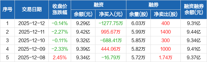 寒锐钴业:融资净偿还1277.75万元,融资余额9.29亿元(12-12)