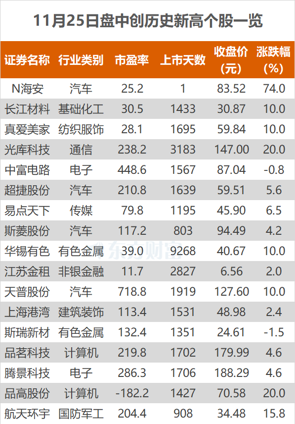11月25日,A股三大指数今日集体走强,截止收盘,沪指涨0.87%,收报3870.02点;深证成指涨1.53%,收报12777.31点;创业板指涨1.77%,收报2980.93点。东方财富Choice数据显示,今日有17只个股盘中股价创历史新高,分别为光库科技、易点天下等。