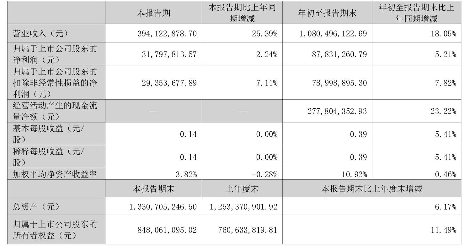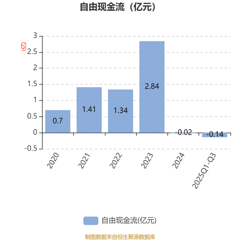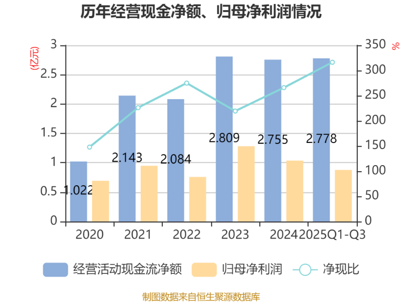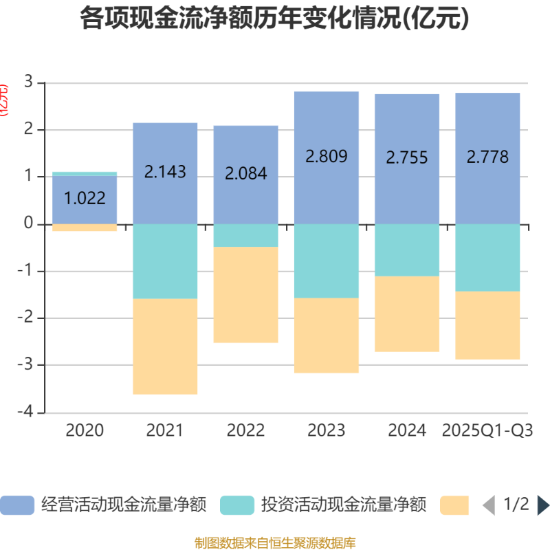 2025年前三季度,公司经营活动现金流净额为2.78亿元,同比增长23.22%;筹资活动现金流净额-1.44亿元,同比减少3495.96万元;投资活动现金流净额-1.43亿元,上年同期为-2.26亿元。