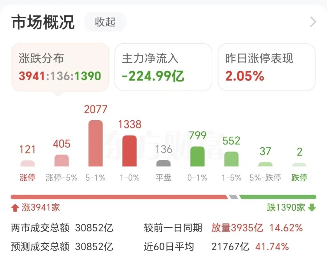 盘面上,全市场超3900只个股上涨,其中121只个股涨停。从板块来看,光伏、商业航天、AI应用、黄金等走高。下跌方面,保险、银行板块跌幅居前。