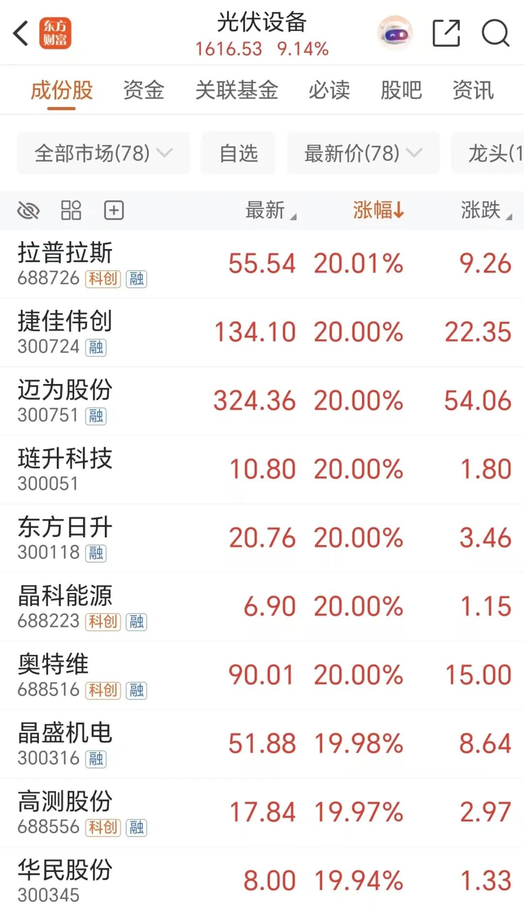 周五太空光伏进一步发酵,光伏设备概念大涨超9%,个股掀起20CM狂潮,拉普拉斯、捷佳伟创、迈为股份等多股20CM涨停。