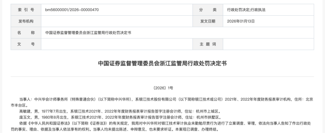 1月13日,浙江证监局披露的行政处罚决定书显示,中兴华所在对银江技术股份有限公司(以下简称“银江技术”)2021年、2022年年度财务报表的审计过程中,对银江技术连续两年虚增收入利润、未披露房产关联担保等情况仍出具标准无保留意见审计报告。