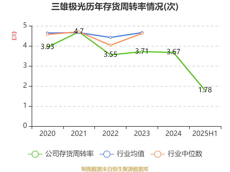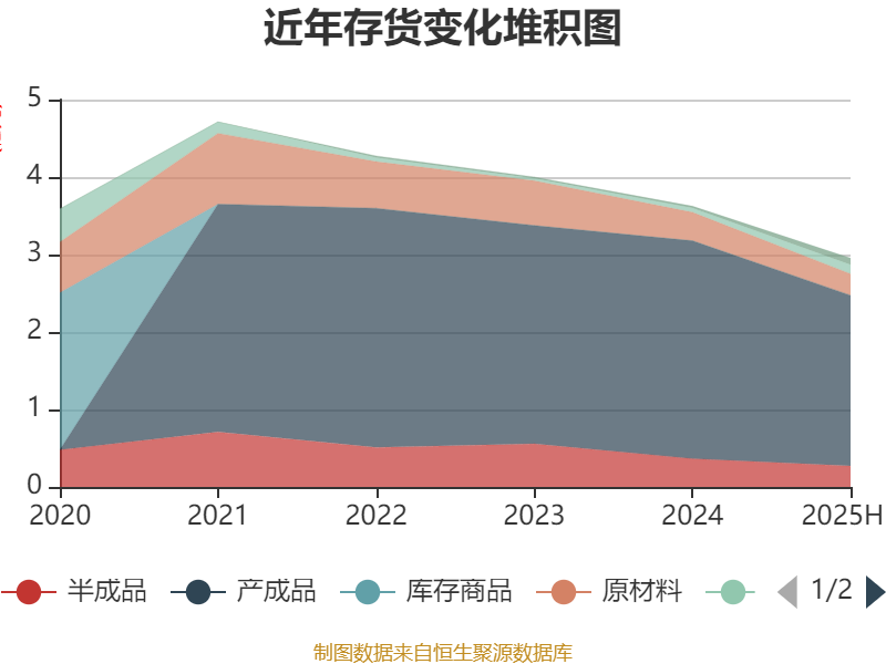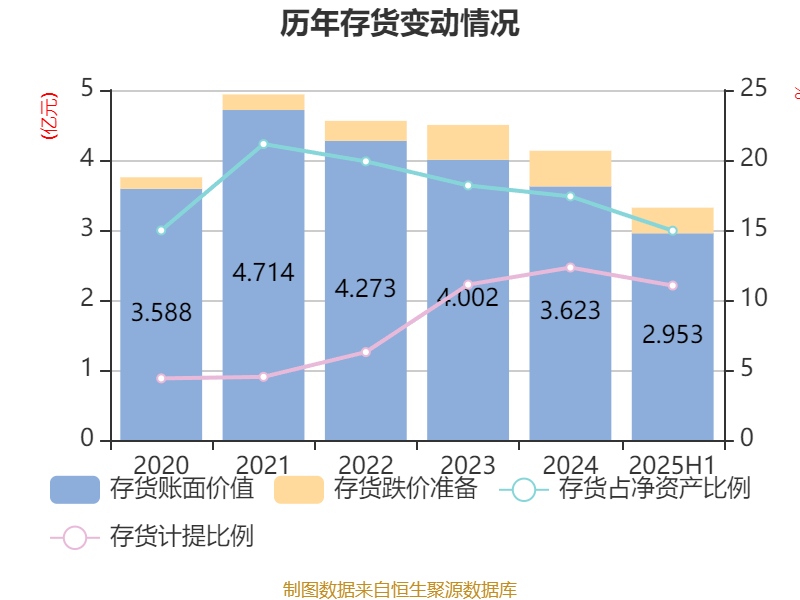 从存货变动来看,截至2025年上半年末,公司存货账面价值为2.95亿元,占净资产的14.95%,较上年末减少6707.64万元。其中,存货跌价准备为3659.57万元,计提比例为11.03%。