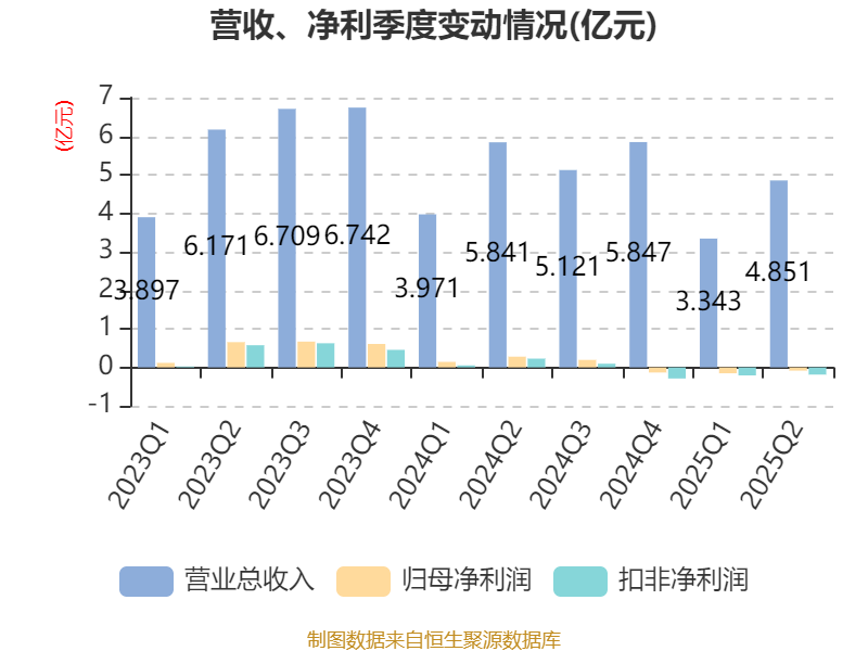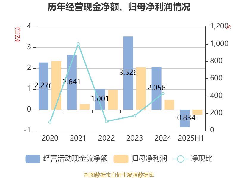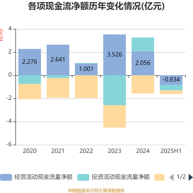 2025年上半年,公司经营活动现金流净额为-8343.45万元,同比减少7266.22万元;筹资活动现金流净额-3200万元,同比增加1.16亿元;投资活动现金流净额-4690.39万元,上年同期为1.51亿元。