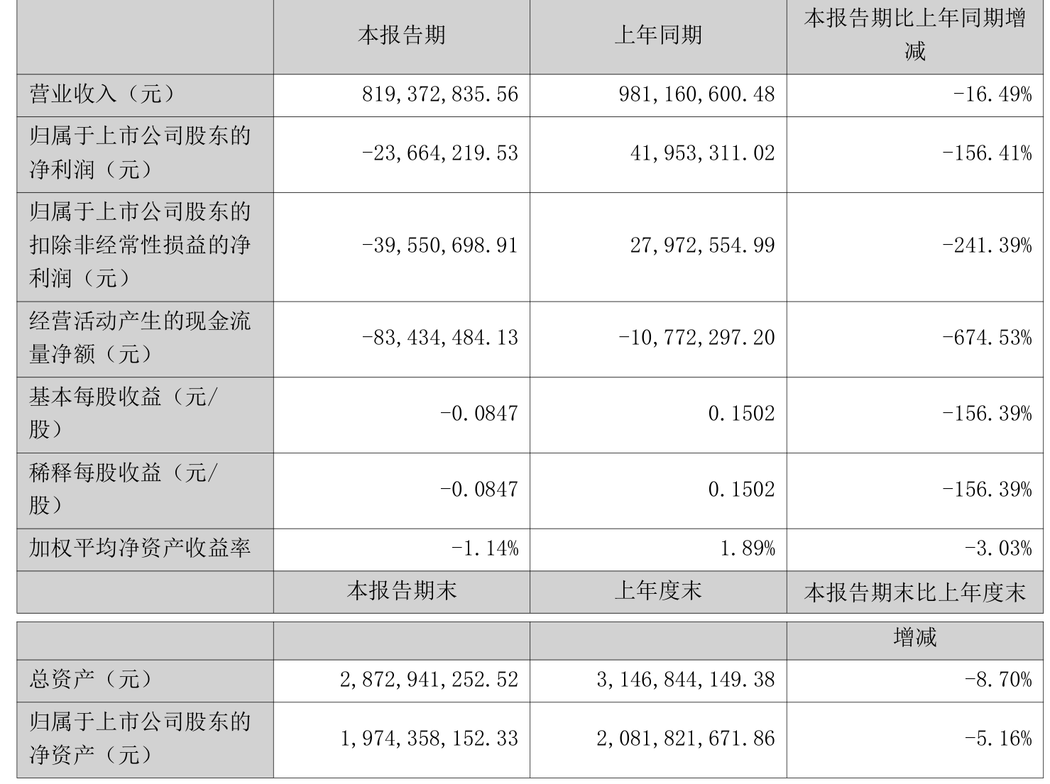 中证智能财讯三雄极光(300625)8月22日披露2025年半年度报告。2025年上半年,公司实现营业总收入8.19亿元,同比下降16.49%;归母净利润亏损2366.42万元,上年同期盈利4195.33万元;扣非净利润亏损3955.07万元,上年同期盈利2797.26万元;经营活动产生的现金流量净额为-8343.45万元,上年同期为-1077.23万元;报告期内,三雄极光基本每股收益为-0.0847元,加权平均净资产收益率为-1.14%。