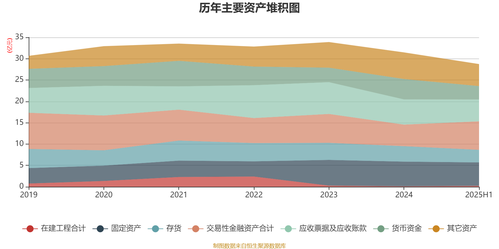 资产重大变化方面,截至2025年上半年,公司交易性金融资产合计较上年末增加32.18%,占公司总资产比重上升7.19个百分点;货币资金较上年末减少34.24%,占公司总资产比重下降4.24个百分点;其他流动资产较上年末减少93.99%,占公司总资产比重下降3.8个百分点;存货较上年末减少18.51%,占公司总资产比重下降1.24个百分点。
