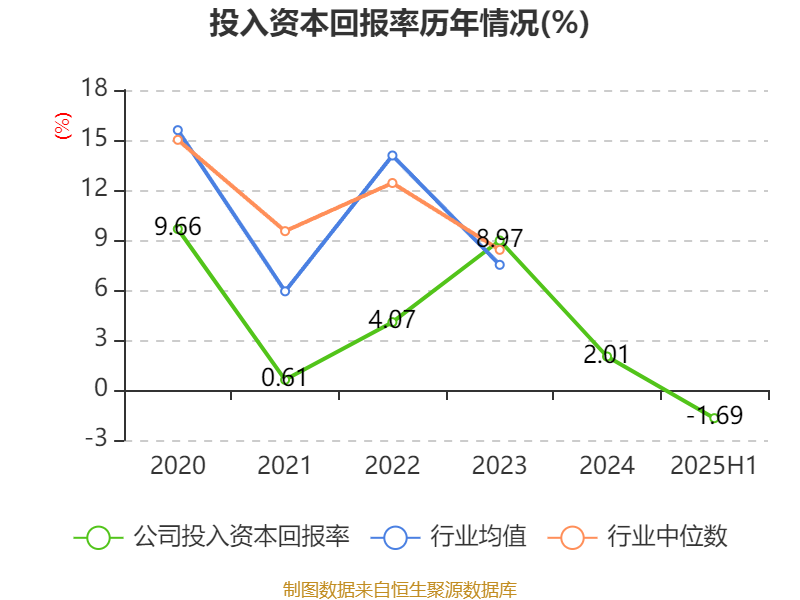 盈利能力方面, 2025年上半年公司加权平均净资产收益率为-1.14%,同比下降3.03个百分点。公司2025年上半年投入资本回报率为-1.69%,较上年同期下降3.53个百分点。