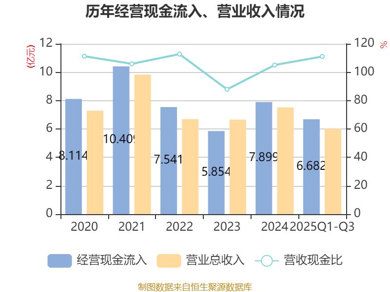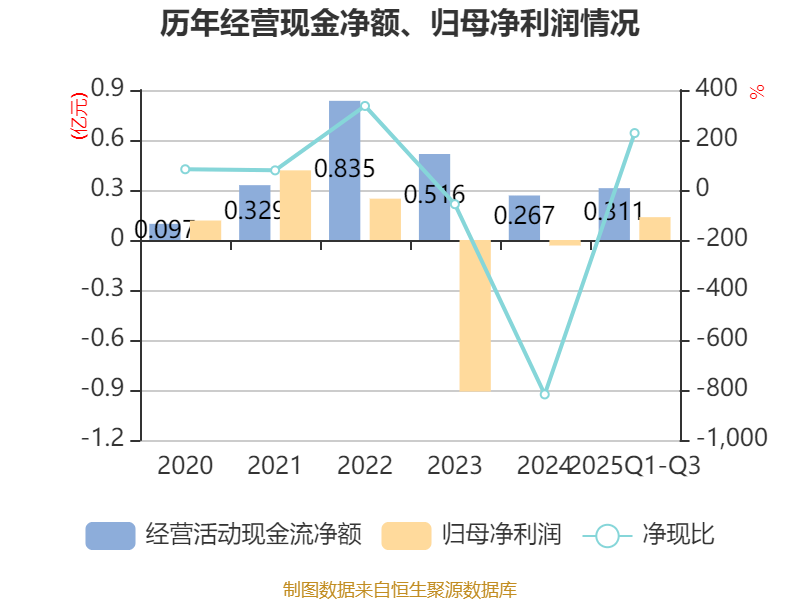 2025年前三季度,公司经营活动现金流净额为3109.34万元,同比增长59.71%;筹资活动现金流净额-156.12万元,同比减少6906.34万元;投资活动现金流净额-812.78万元,上年同期为-590.92万元。