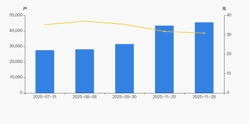 2025年7月31日至今,公司股东户数显著大幅增长,区间涨幅达65.12%。2025年7月31日至2025年11月28日区间股价下降12.36%。