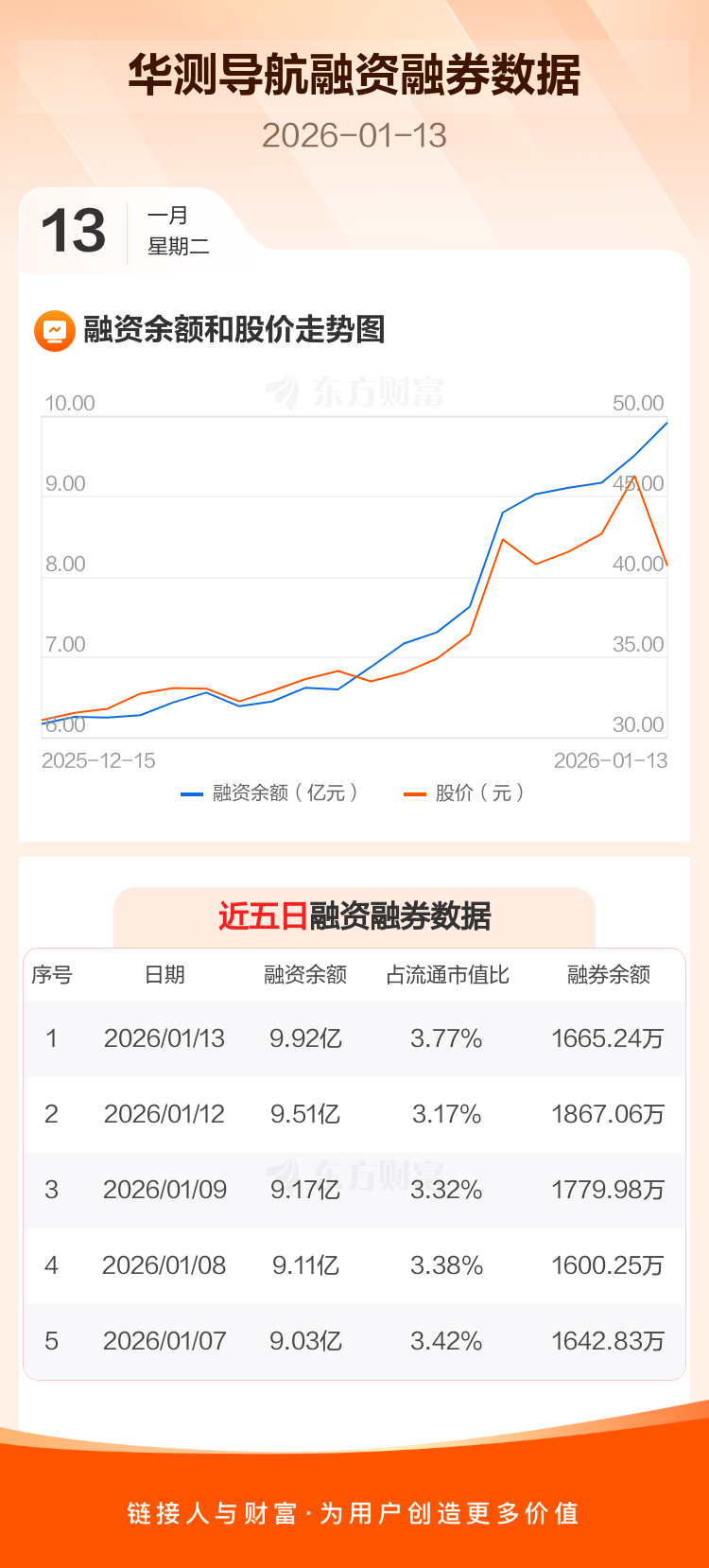交易所最新数据显示,华测导航于2026年1月13日获融资买入3.26亿元,融资偿还2.86亿元,当日融资净买入4090.05万元。目前,该股融资余额9.92亿,占流通市值比例为3.77%。