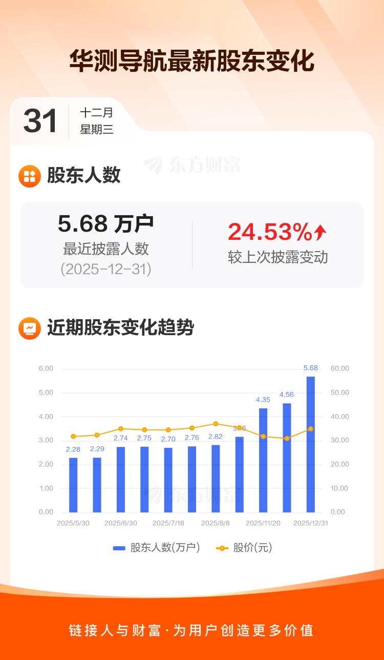 华测导航:截至12月31日最新股东户数5.68万户,较上期增加24.53%