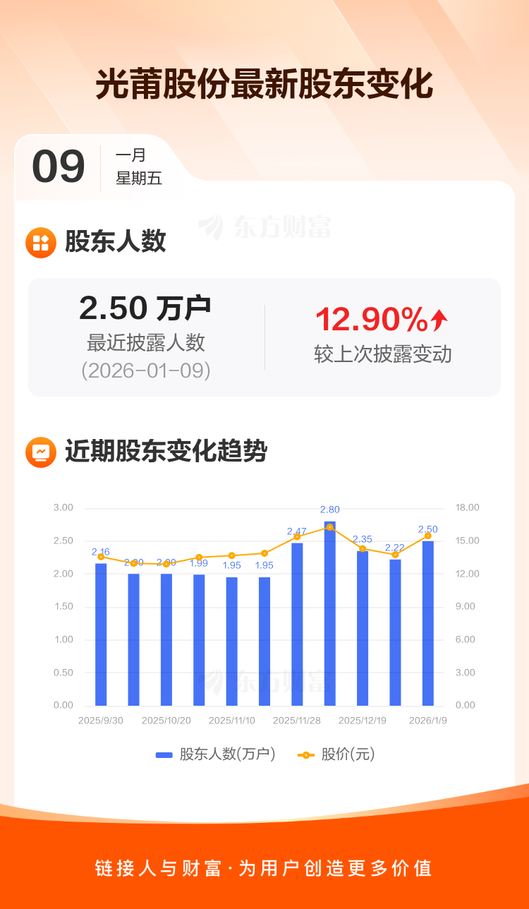 光莆股份最新披露数据显示,截至1月9日公司股东户数为2.50万户,较上期(2025年12月31日)增加2858户,增幅为12.90%。户均持有流通股数量由上期的9986股下降至8845股,户均持股金额由上期的13.74万元减少至13.69万元。