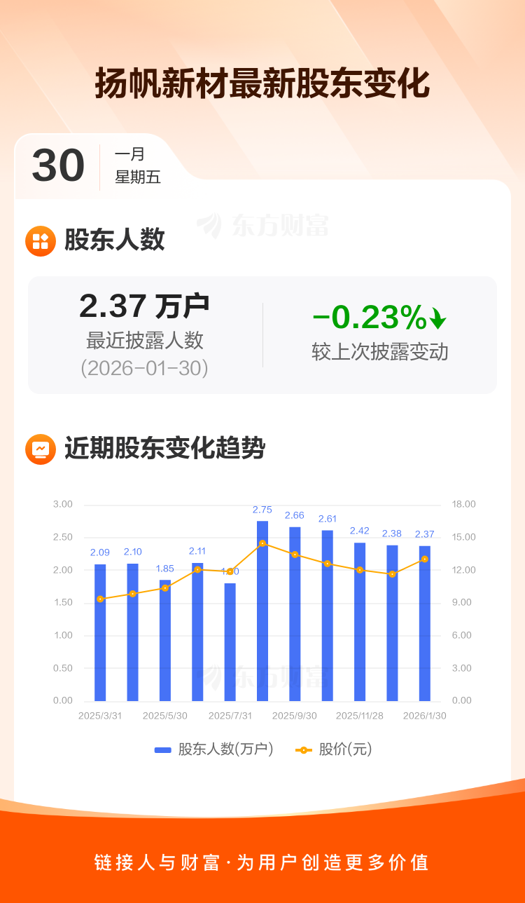 扬帆新材:截至1月30日最新股东户数2.37万户,较上期减少0.23%