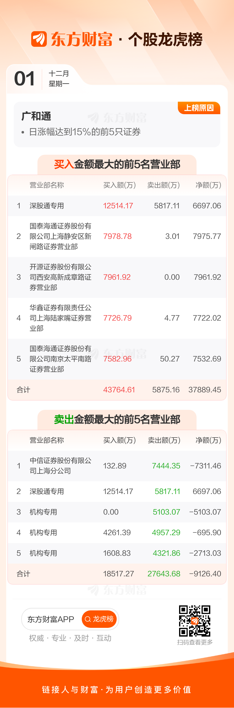 交易所2025年12月1日公布的交易公开信息显示,广和通因成为日涨幅达到15%的前5只证券上榜。广和通当日收报32.38元,涨跌幅20.01%,偏离值20.00%,换手率27.35%,成交额45.28亿。