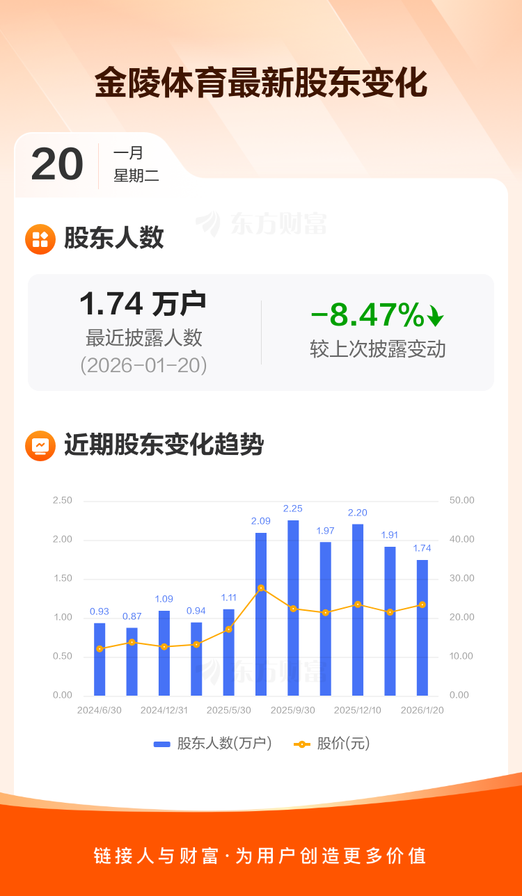 金陵体育:截至1月20日最新股东户数1.74万户,较上期减少8.47%