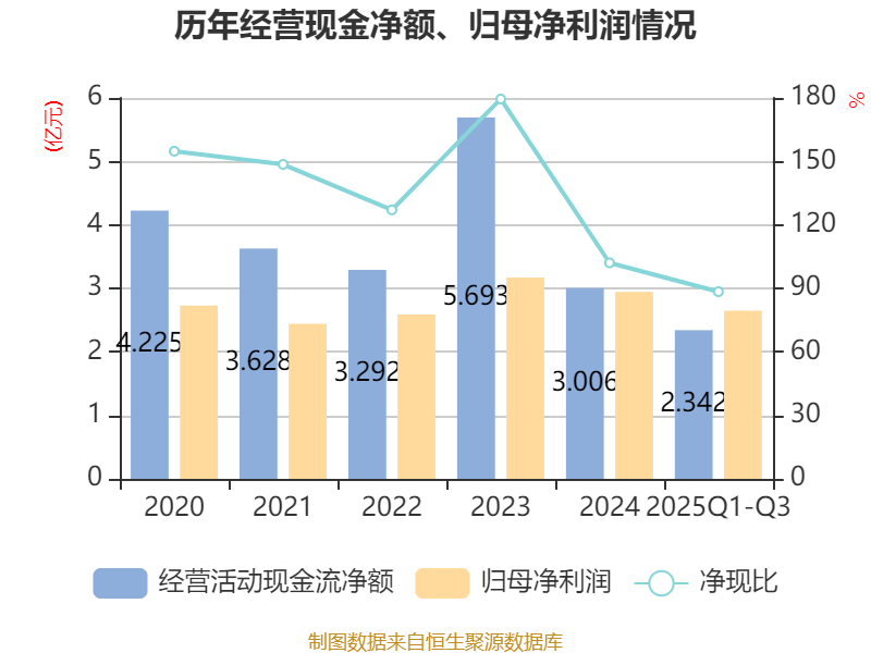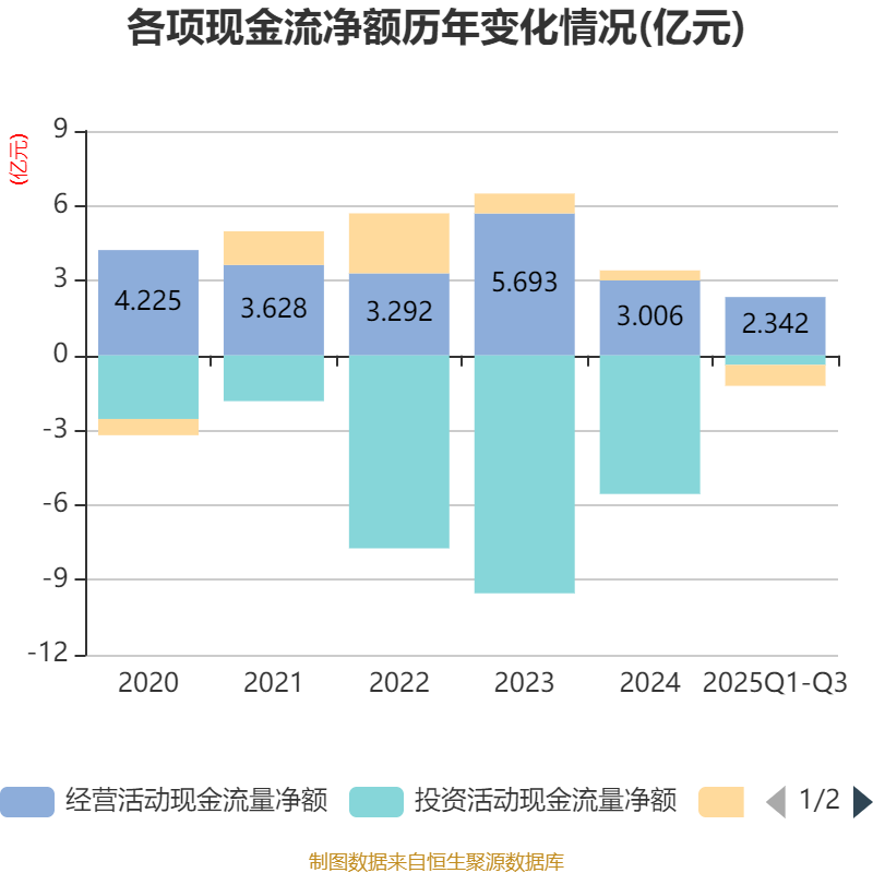 2025年前三季度,公司经营活动现金流净额为2.34亿元,同比下降34.61%;筹资活动现金流净额-8407.69万元,同比减少1.76亿元;投资活动现金流净额-3789.98万元,上年同期为-3.45亿元。