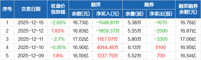 圣邦股份融资融券信息显示,2025年12月15日融资净偿还1048.81万元;融资余额16.73亿元,较前一日下降0.62%。