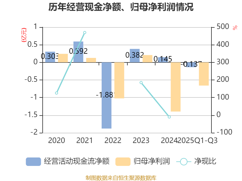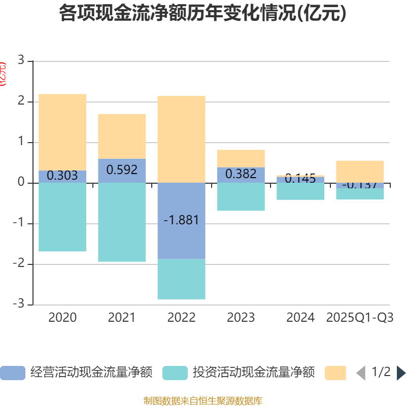 2025年前三季度,公司经营活动现金流净额为-1371.42万元,同比增加1640.17万元;筹资活动现金流净额5418.87万元,同比增加5272.29万元;投资活动现金流净额-2750.74万元,上年同期为-3257.58万元。