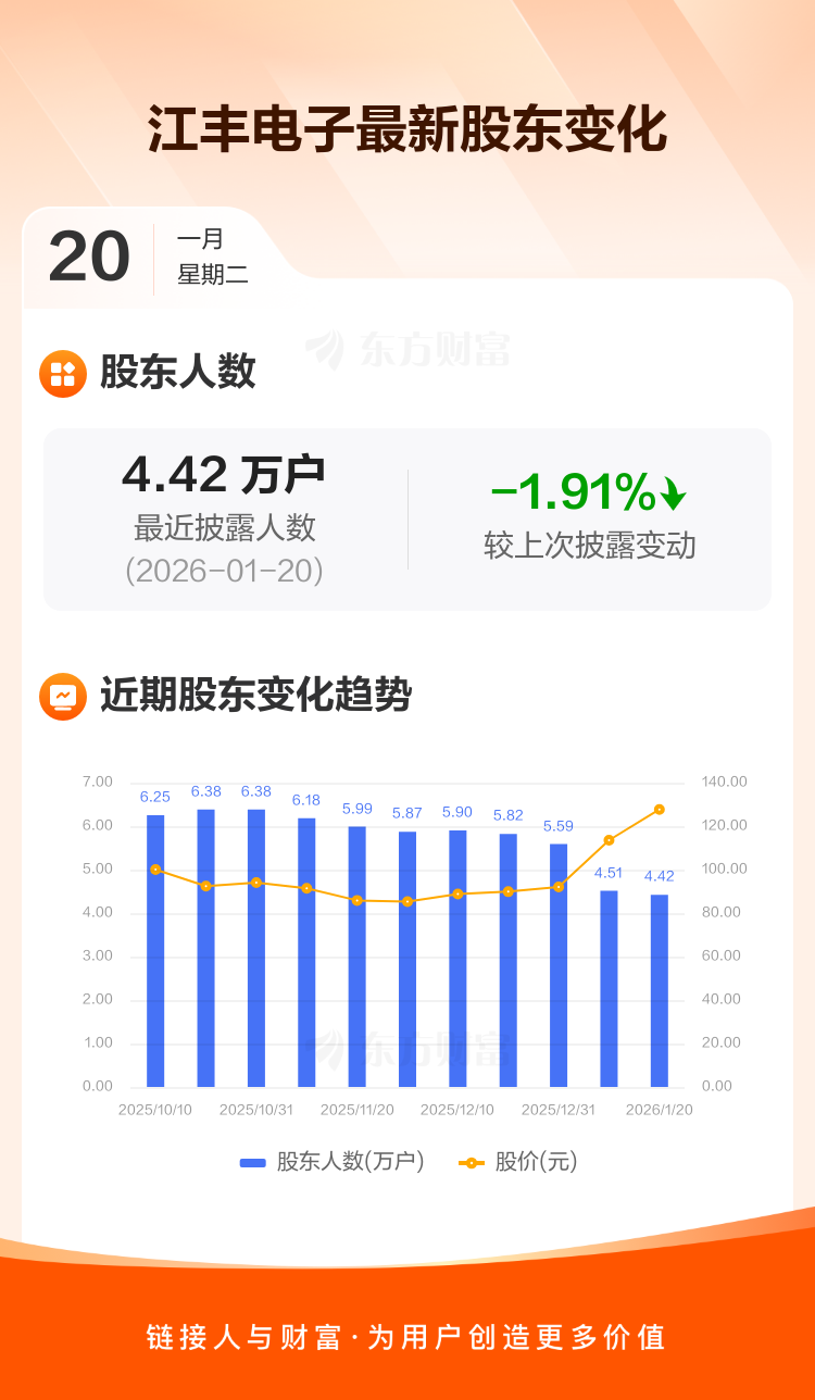 江丰电子最新披露数据显示,截至1月20日公司股东户数为4.42万户,较上期(2026年1月9日)减少863户,降幅为1.91%。户均持有流通股数量由上期的4904股上升至5000股,户均持股金额由上期的55.67万元增加至63.83万元。