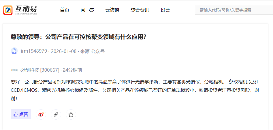 必创科技:公司部分产品可针对核聚变领域中的高温等离子体进行光谱学诊断