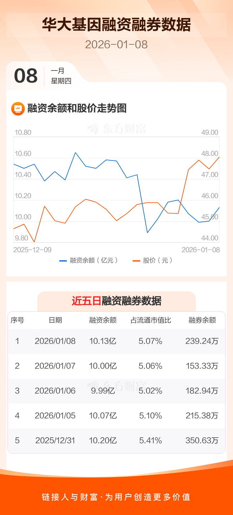 交易所最新数据显示,华大基因于2026年1月8日获融资买入4413.70万元,融资偿还3061.73万元,当日融资净买入1351.96万元。目前,该股融资余额10.13亿,占流通市值比例为5.07%。