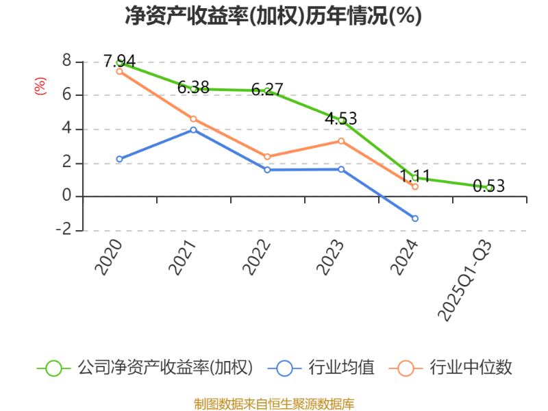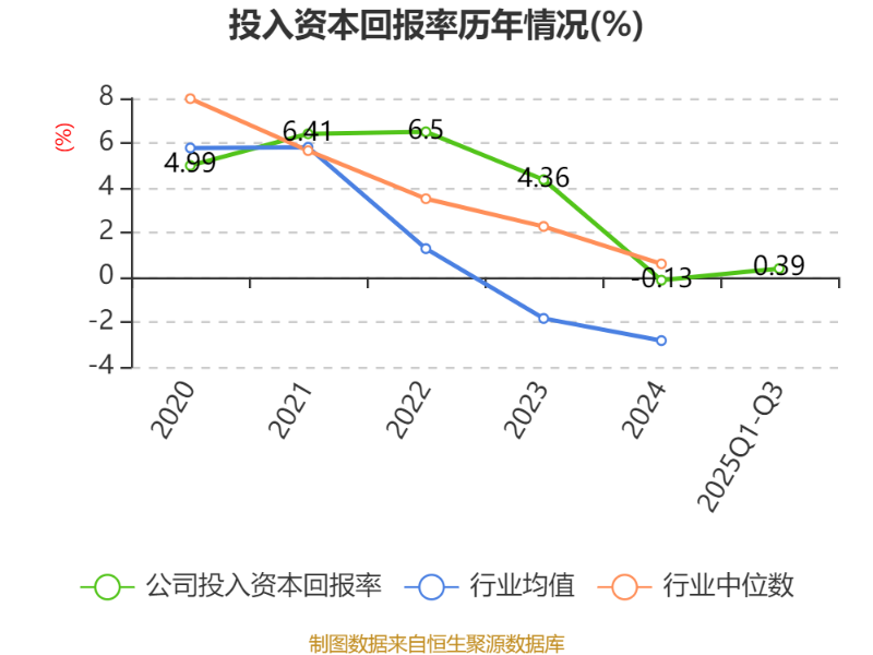 盈利能力方面, 2025年前三季度公司加权平均净资产收益率为0.53%,同比下降0.19个百分点。公司2025年前三季度投入资本回报率为0.39%,较上年同期下降0.04个百分点。